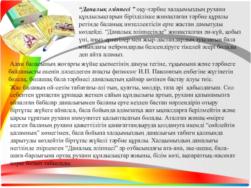 Слайд 10“Даналық әліппесі ” оқу-тәрбие халқымыздың рухани құндылықтарын бірізділікке жинақтаған тәрбие құралы