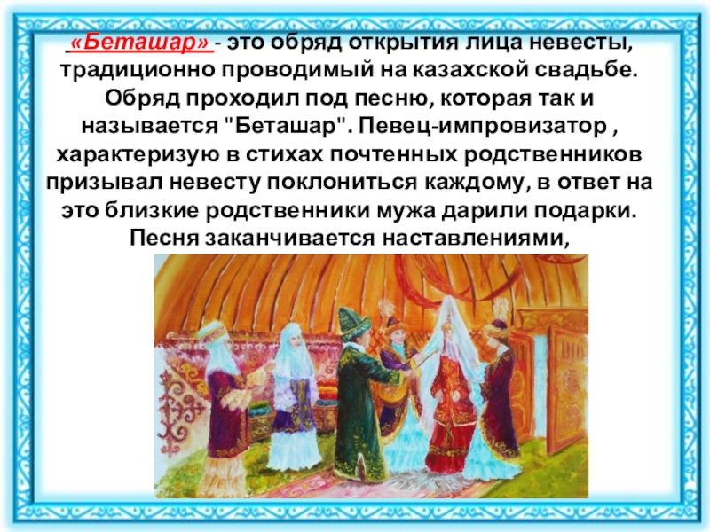 Слайд 13 «Беташар» - это обряд открытия лица невесты, традиционно проводимый на казахской