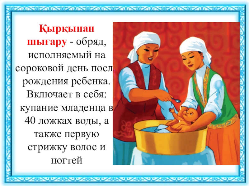 Слайд 18Қырқынан шығару - обряд, исполняемый на сороковой день после рождения ребенка. Включает