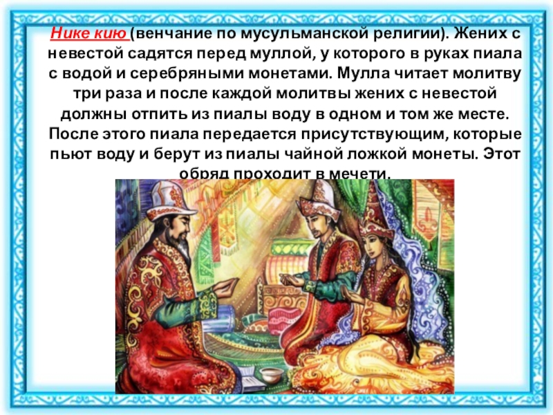 Слайд 15Нике кию (венчание по мусульманской религии). Жених с невестой садятся перед