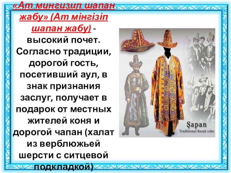 Слайд 6«Ат мингизип шапан жабу» (Ат мінгізіп шапан жабу) - высокий почет. Согласно