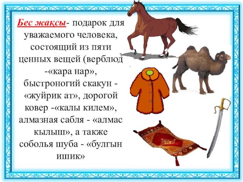 Слайд 7Бес жақсы- подарок для уважаемого человека, состоящий из пяти ценных вещей