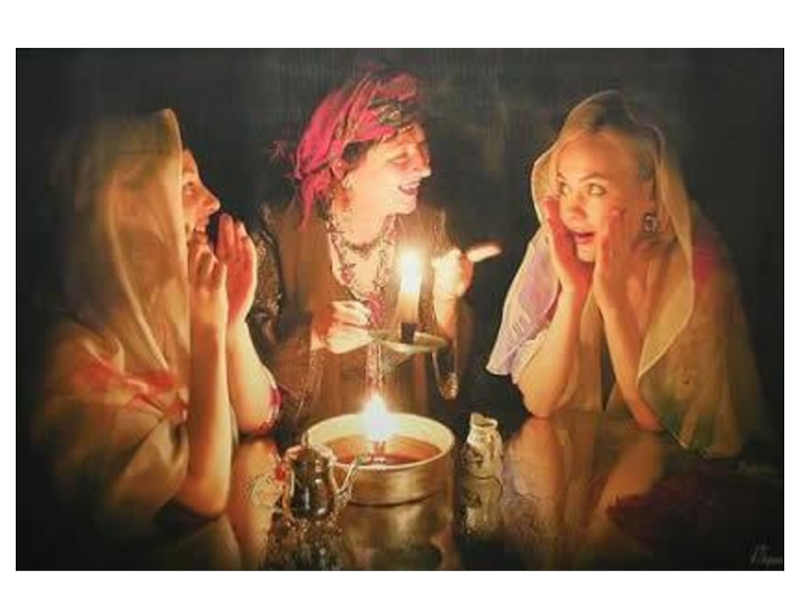 В.А.ЖуковскийРаз в крещенский вечерок Девушки гадали: За ворота башмачок, Сняв с ноги, бросали; Снег пололи; под окном Слушали; кормили Счетным курицу зерном; Ярый воск топили; В чашу с чистою водой Клали перстень золотой, Серьги изумрудны; Расстилали