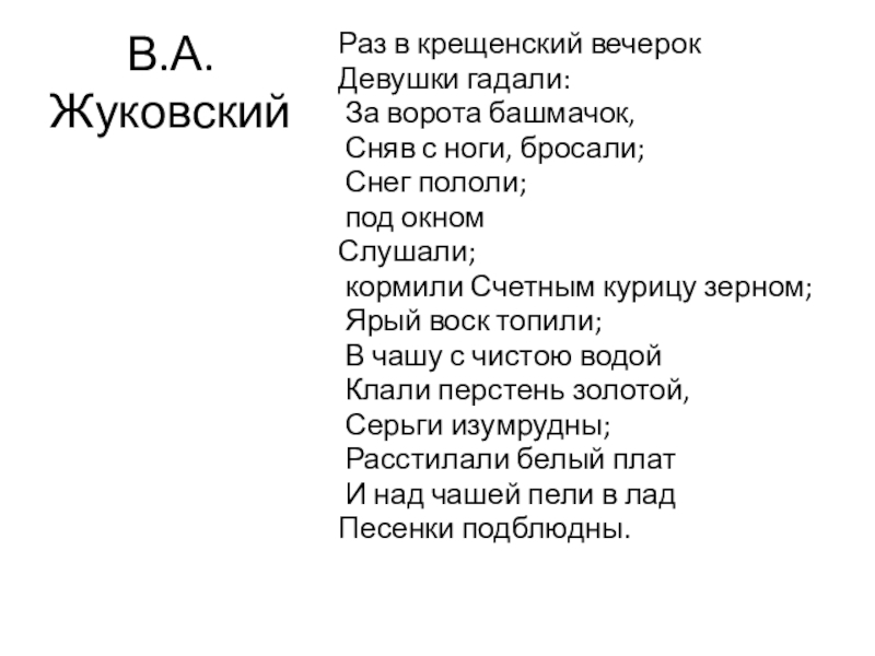 В.А.ЖуковскийРаз в крещенский вечерок Девушки гадали: За ворота башмачок, Сняв с ноги, бросали; Снег пололи; под окном