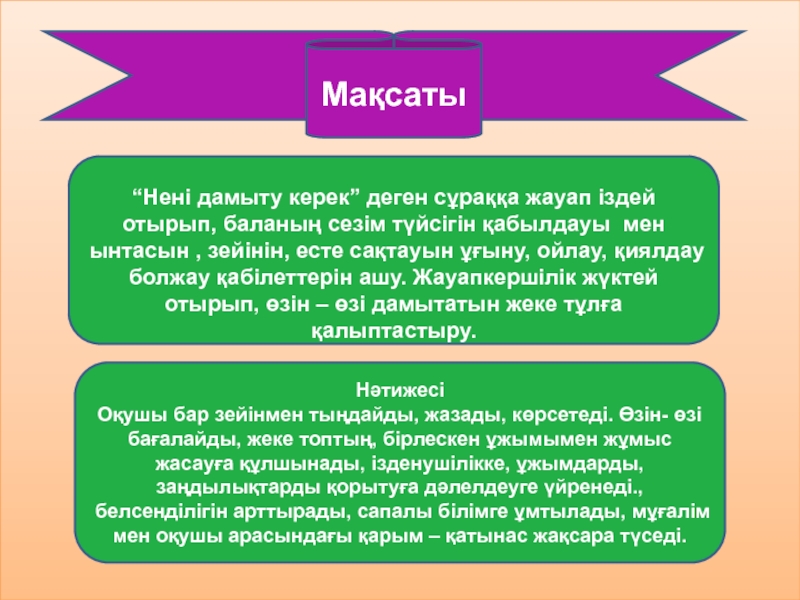 “Нені дамыту керек” деген сұраққа жауап іздей отырып, баланың сезім түйсігін қабылдауы мен ынтасын , зейінін, есте сақтауын ұғыну, ойлау, қиялдау болжау қабілеттерін ашу. Жауапкершілік жүктей отырып, өзін – өзі дамытатын жеке тұлға қалыптастыру.