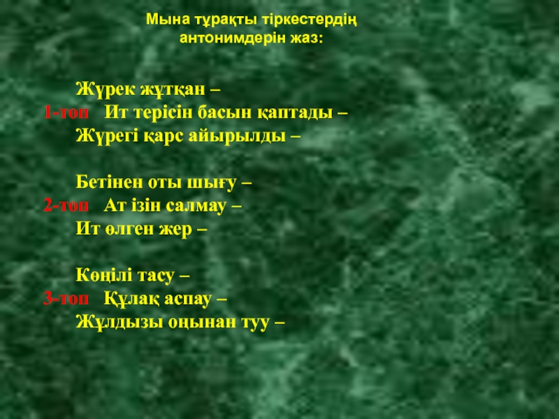 Мына тұрақты тіркестердің антонимдерін жаз: