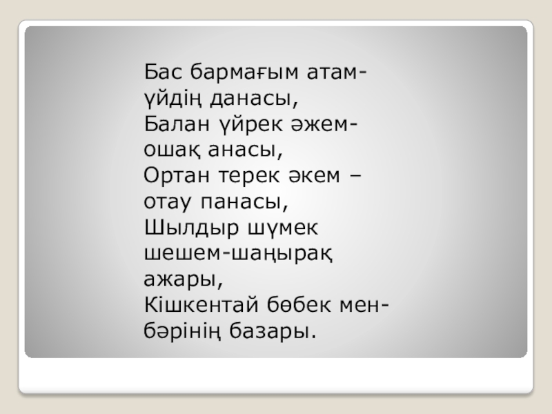 Слайд 10Бас бармағым атам-үйдің данасы, Балан үйрек әжем-ошақ анасы, Ортан терек әкем –отау панасы, Шылдыр