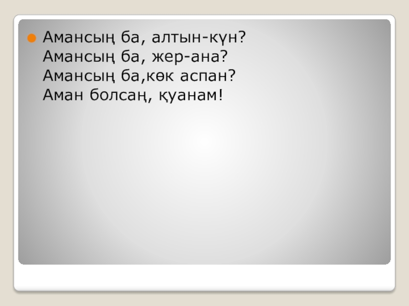 Слайд 3Амансың ба, алтын-күн? Амансың ба, жер-ана? Амансың ба,көк аспан? Аман болсаң, қуанам!