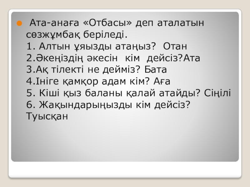 әкесін  кім  дейсіз?Ата 3.Ақ тілекті не дейміз? Бата 4.Ініге қамқор адам кім? Аға 5. Кіші қыз баланы қалай атайды? Сіңілі 6. Жақындарыңызды кім дейсіз? Туысқан