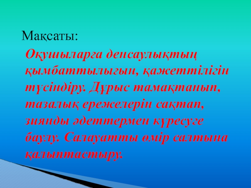 Оқушыларға денсаулықтың қымбаттылығын, қажеттілігін түсіндіру. Дұрыс тамақтанып, тазалық ережелерін