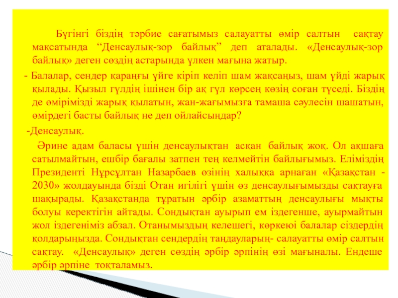 Әрине адам баласы үшін денсаулықтан асқан байлық жоқ. Ол ақшаға сатылмайтын, ешбір бағалы затпен тең келмейтін байлығымыз. Еліміздің Президенті Нұрсұлтан Назарбаев өзінің халыққа арнаған «Қазақстан - 2030» жолдауында бізді Отан игілігі үшін өз денсаулығымызды сақтауға шақырады. Қазақстанда тұратын әрбір азаматтың денсаулығы мықты болуы керектігін айтады. Сондықтан ауырып ем іздегенше, ауырмайтын жол іздегеніміз абзал. Отанымыздың келешегі, көркеюі балалар сіздердің қолдарыңызда. Сондықтан сендердің таңдауларың- салауатты өмір салтын сақтау. «Денсаулық» деген сөздің әрбір әрпінің өзі мағыналы. Ендеше әрбір әрпіне тоқталамыз.