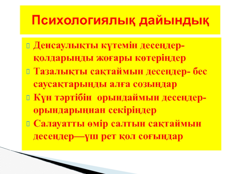 Слайд 5Денсаулықты күтемін десеңдер- қолдарыңды жоғары көтеріңдер
