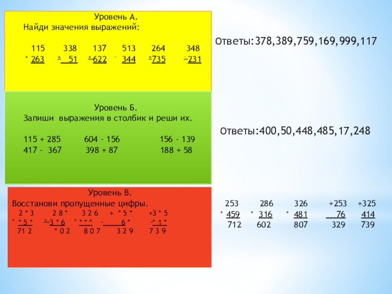 Ответы:378,389,759,169,999,117Ответы:400,50,448,485,17,248 253    286    326    +253  +325+ 459