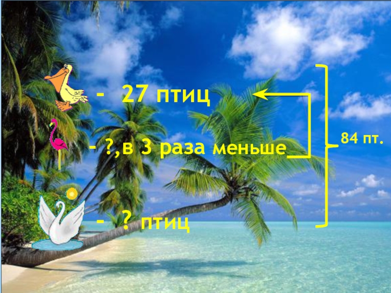 - 27 птиц - ?,в 3 раза меньше - ? птиц84 пт.