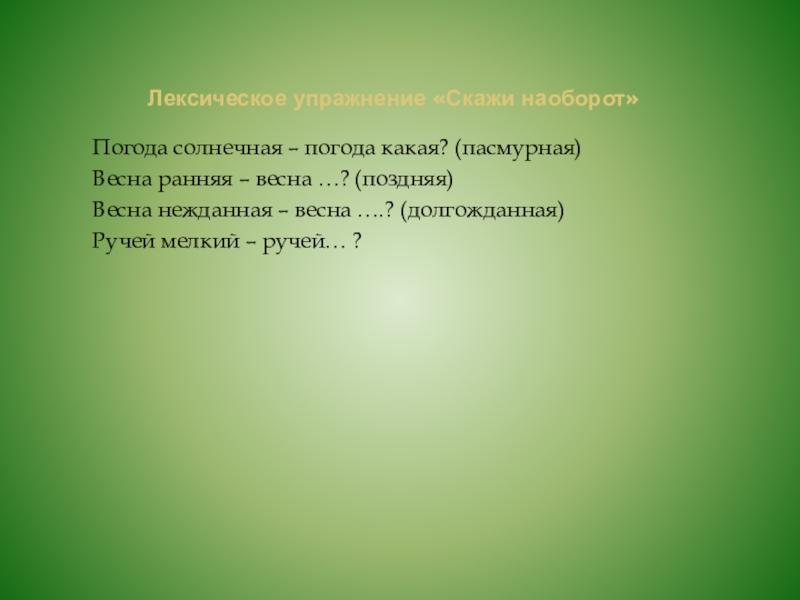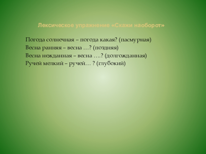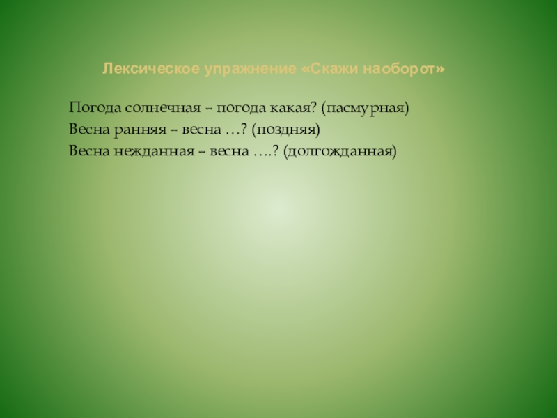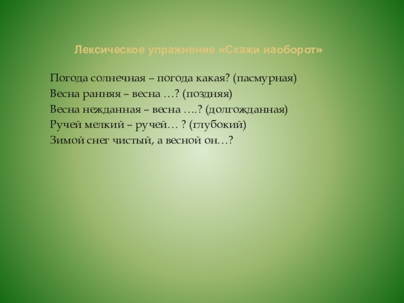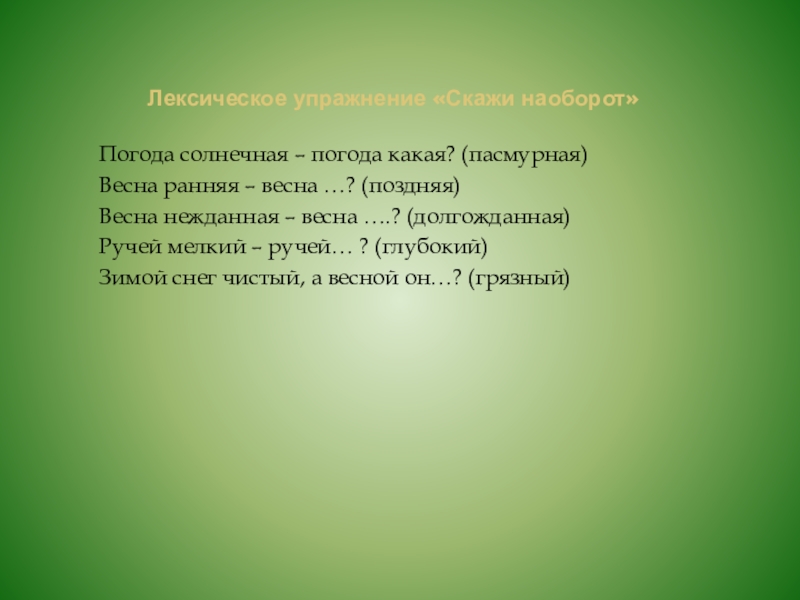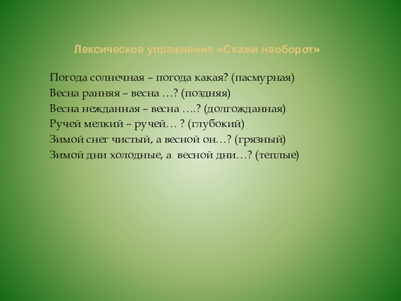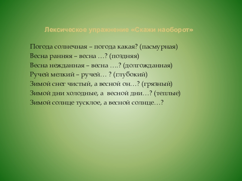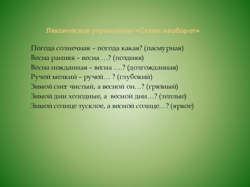 Слайд 40Лексическое упражнение «Скажи наоборот»