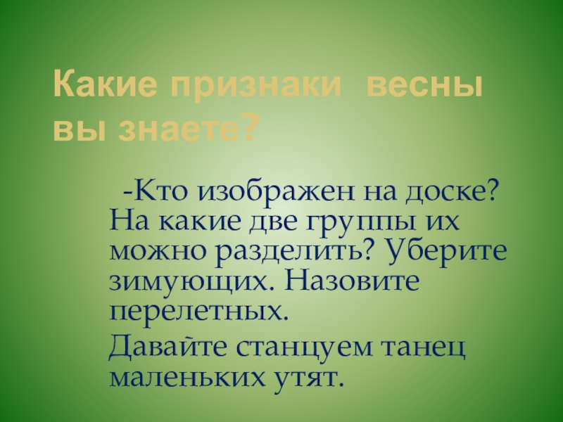 -Кто изображен на доске? На какие две группы их можно разделить? Уберите зимующих. Назовите перелетных.