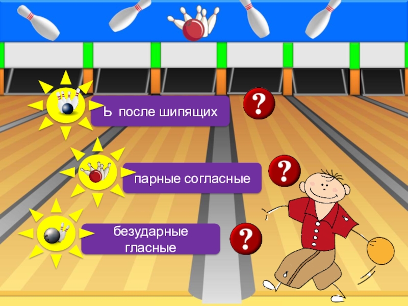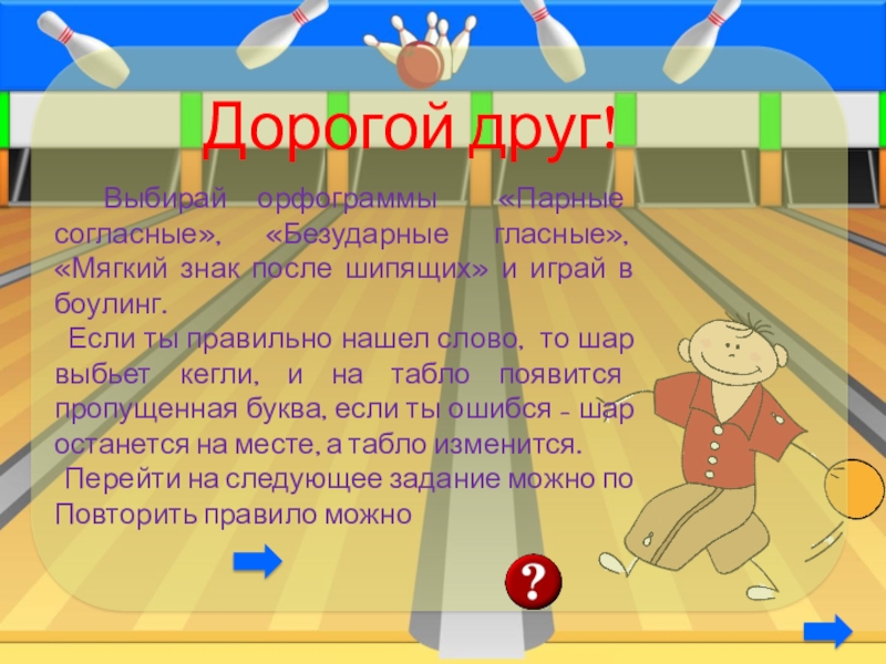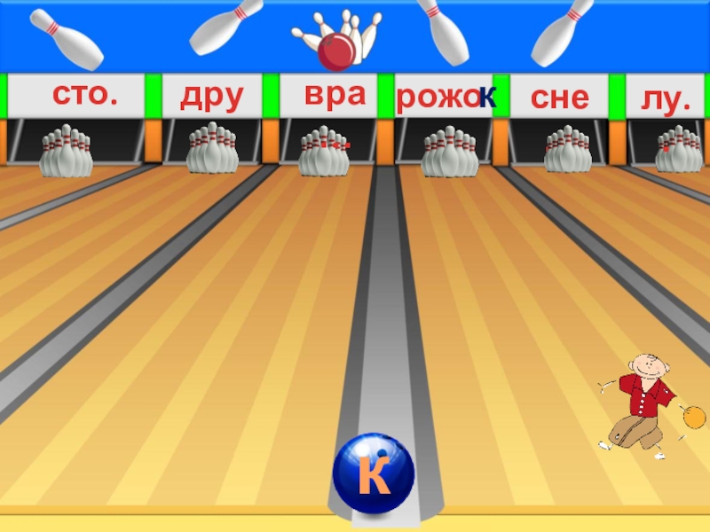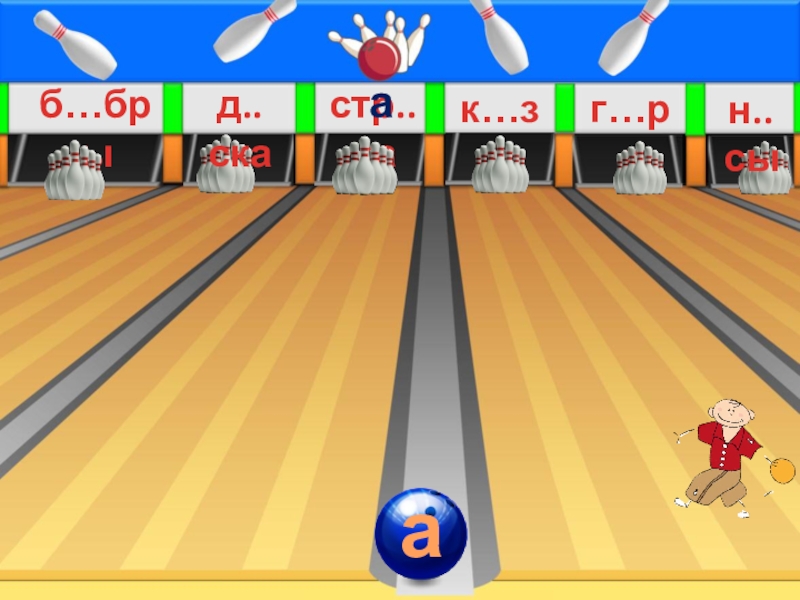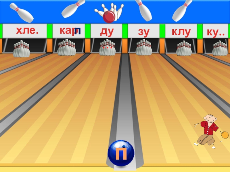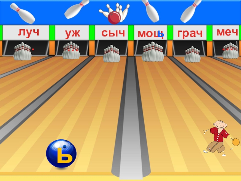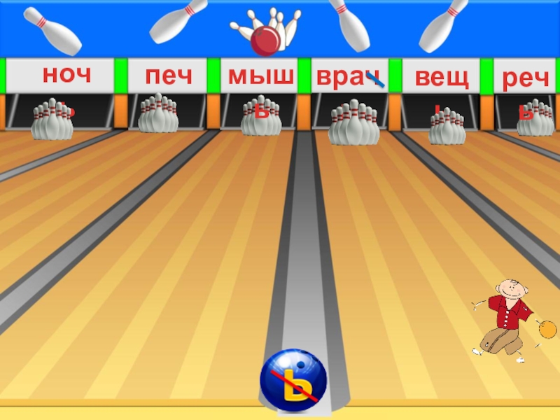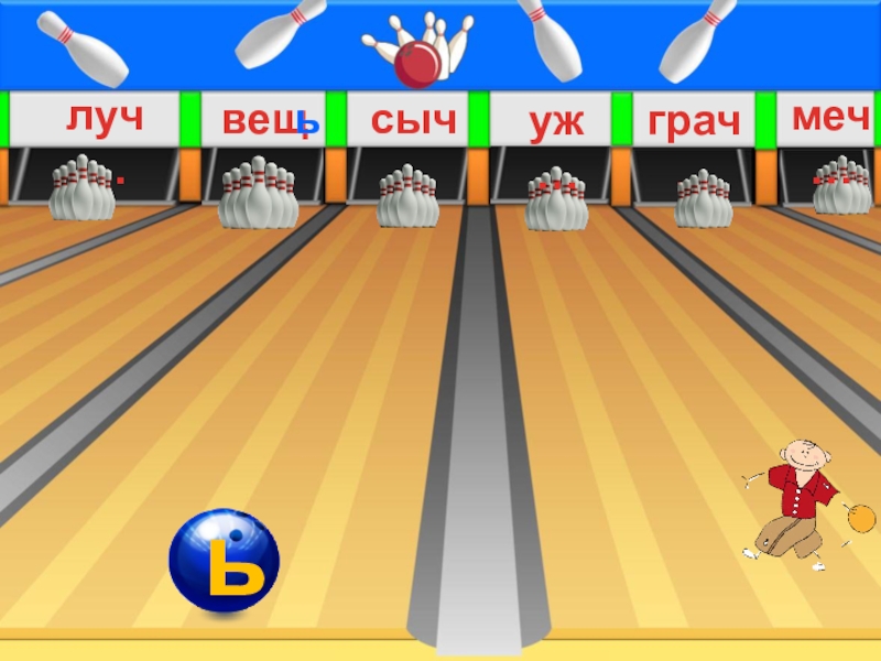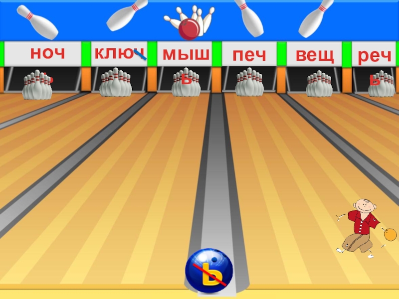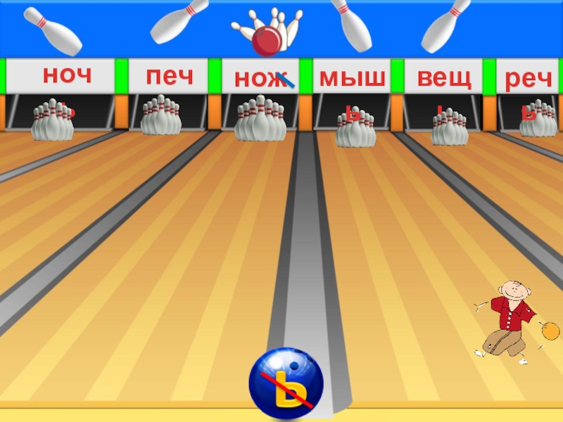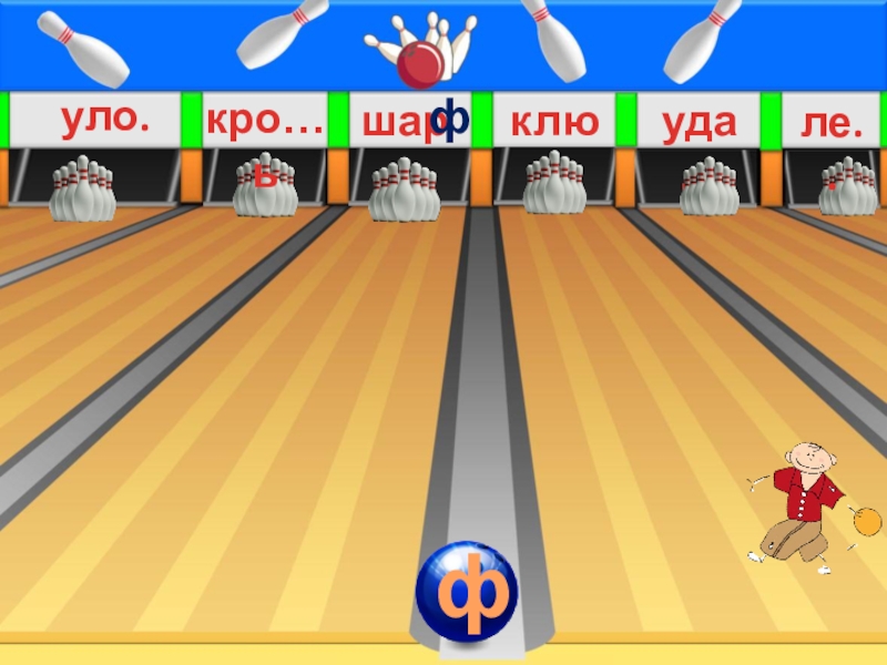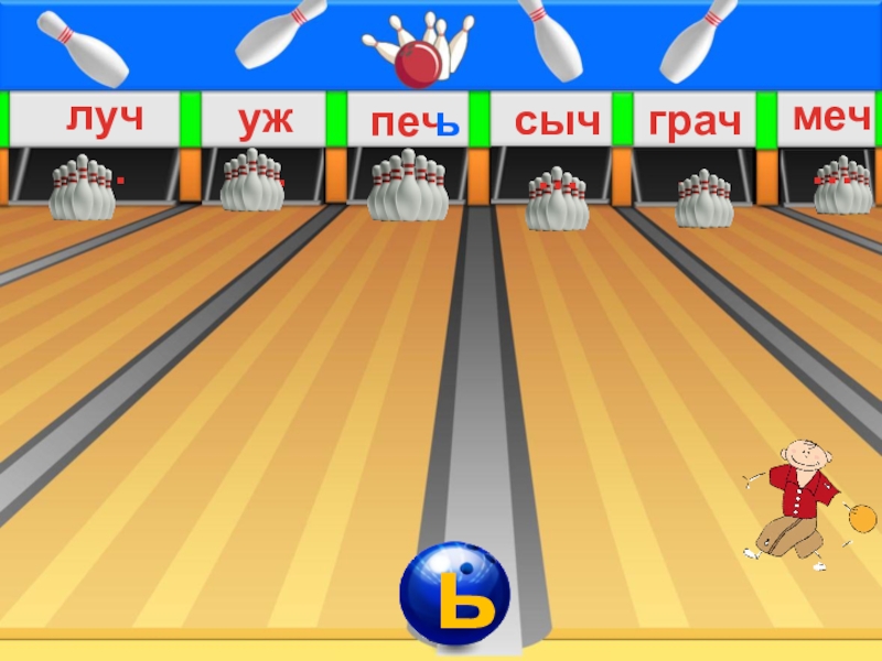 Если ты правильно нашел слово, то шар выбьет кегли, и на табло появится пропущенная буква, если ты ошибся – шар останется на месте, а табло изменится.