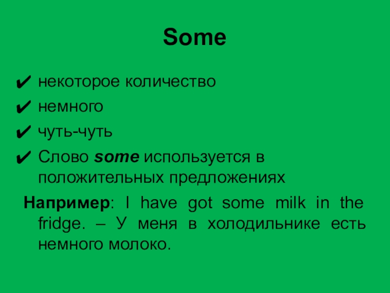Someнекоторое количествонемногочуть-чутьСлово some используется в положительных предложенияхНапример: I have got some milk in the fridge. – У