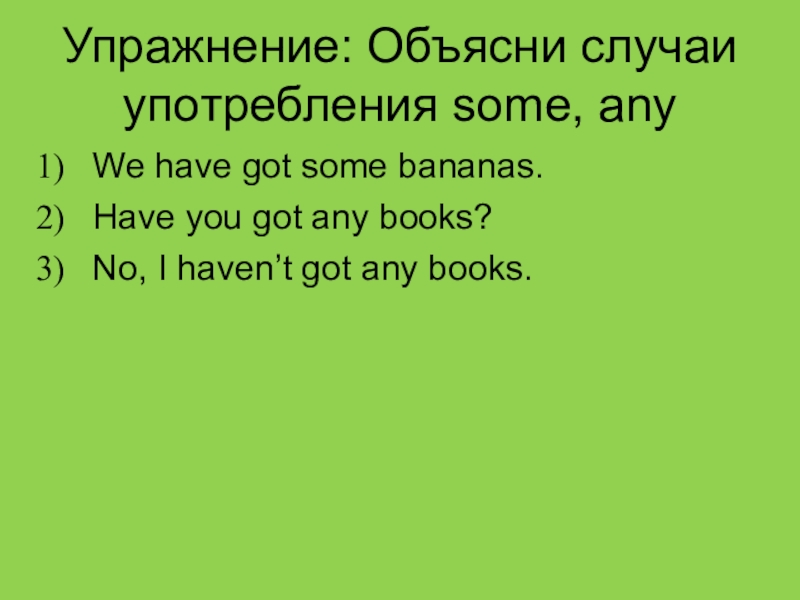 Упражнение: Объясни случаи употребления some, anyWe have got some bananas.Have you got any books?No, I haven’t got