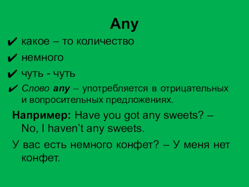 Any какое – то количествонемногочуть - чутьСлово any – употребляется в отрицательных и вопросительных предложениях.Например: Have you