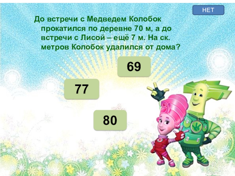НЕТ До встречи с Медведем Колобок прокатился по деревне 70 м, а до встречи с Лисой –
