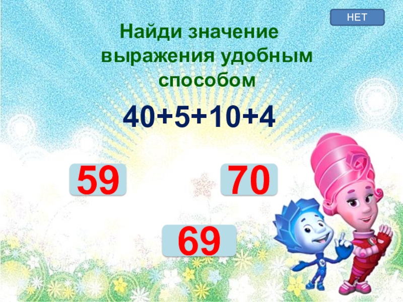 НЕТ597069Найди значение выражения удобным способом40+5+10+4