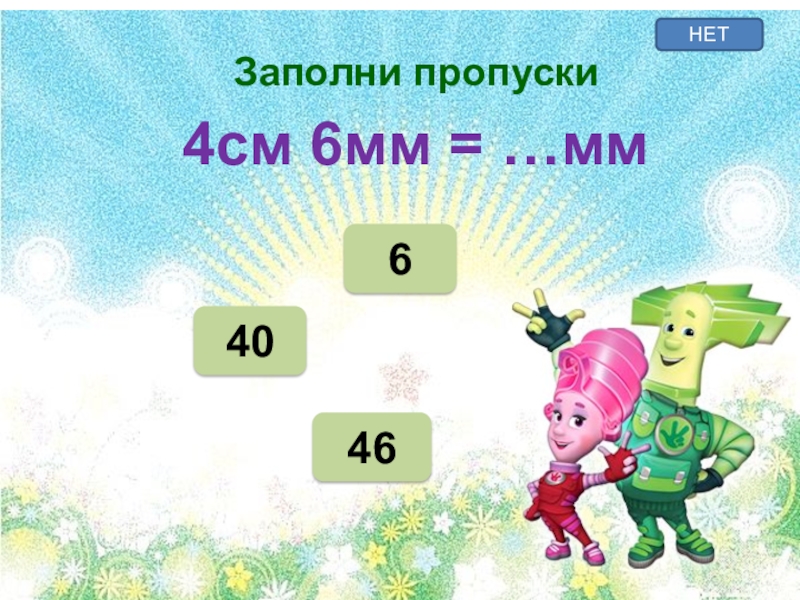 НЕТ46640Заполни пропуски4см 6мм = …мм