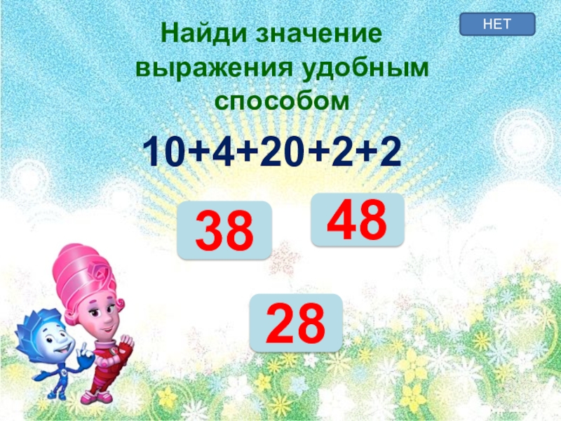 НЕТНайди значение выражения удобным способом10+4+20+2+2384828