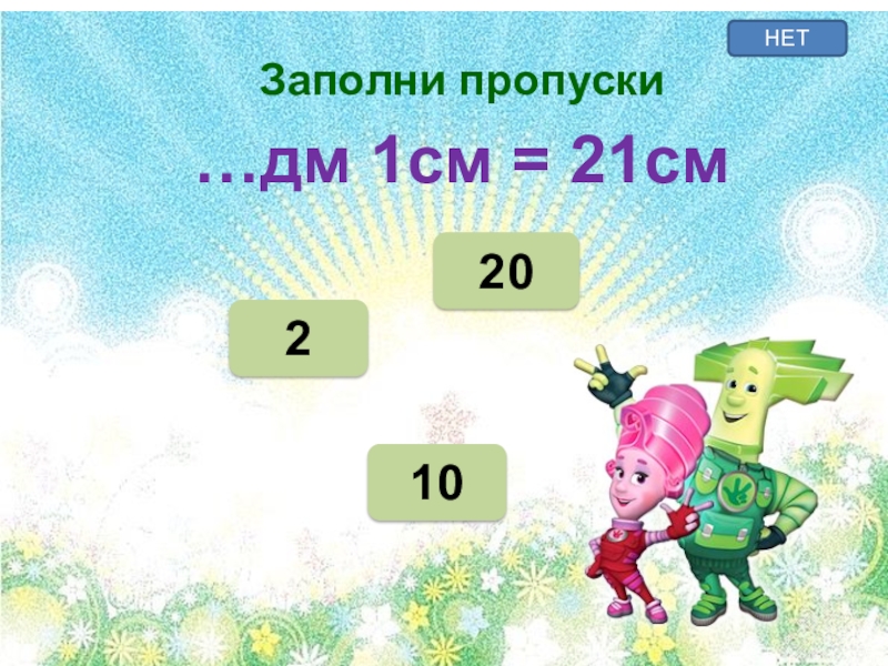 НЕТ21020Заполни пропуски…дм 1см = 21см
