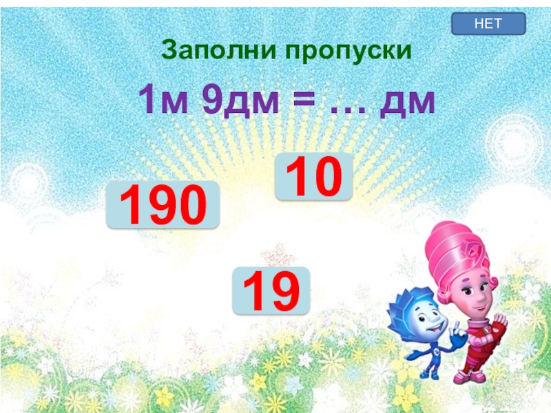 НЕТ1910190Заполни пропуски1м 9дм = … дм