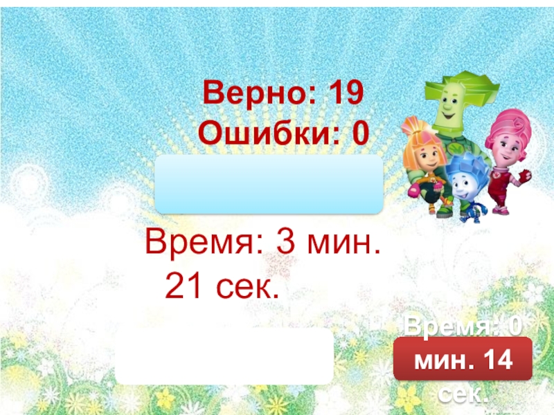 Верно: 19 Ошибки: 0 Отметка: 5Время: 3 мин. 21 сек.Время: 0 мин. 14 сек.