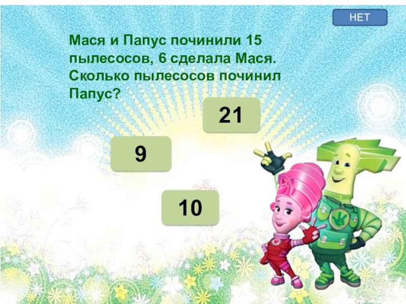 НЕТ  Мася и Папус починили 15 пылесосов, 6 сделала Мася. Сколько пылесосов починил Папус?92110