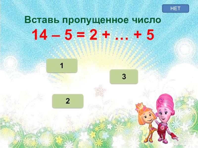 НЕТ213Вставь пропущенное число 14 – 5 = 2 + … + 5