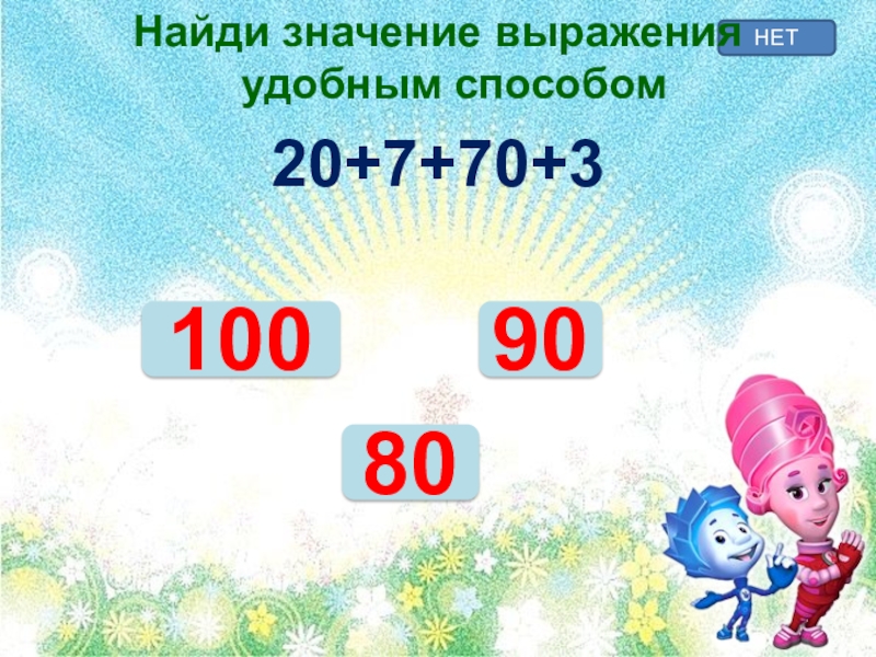 НЕТ1008090Найди значение выражения удобным способом20+7+70+3