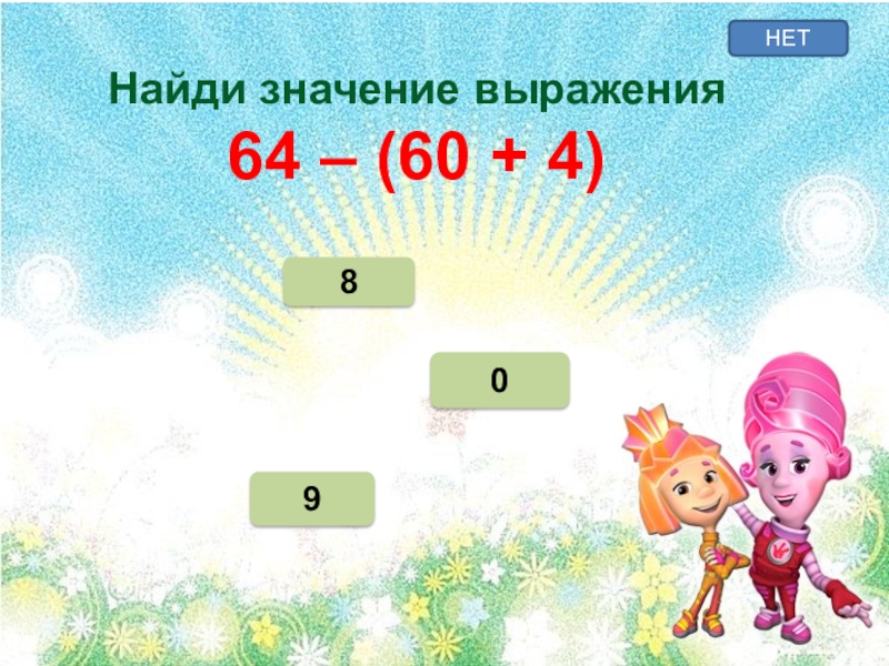 НЕТ089Найди значение выражения 64 – (60 + 4)