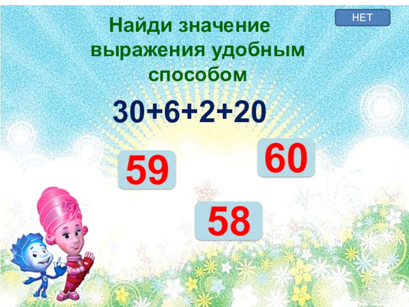 НЕТ586059Найди значение выражения удобным способом30+6+2+20
