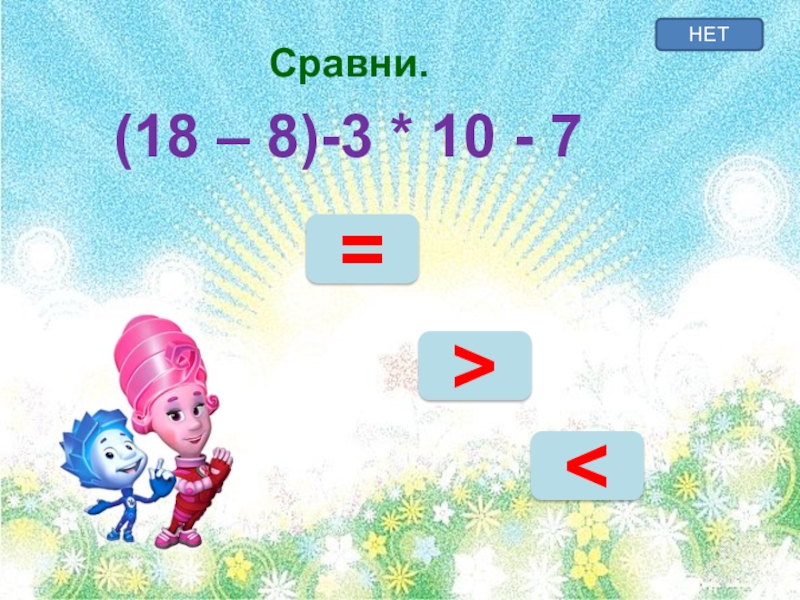 НЕТСравни.(18 – 8)-3 * 10 - 7>=