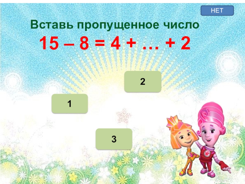 НЕТ123Вставь пропущенное число 15 – 8 = 4 + … + 2