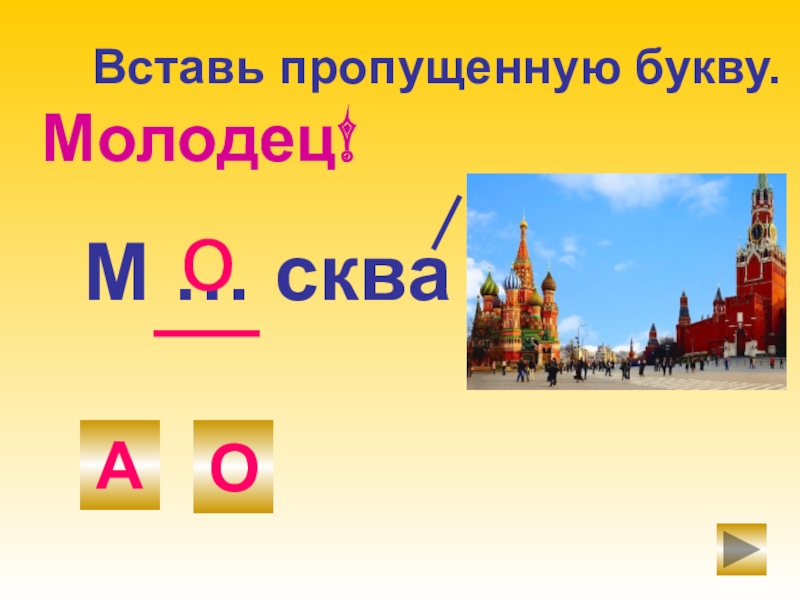 М … скваОАоМолодец!Вставь пропущенную букву.