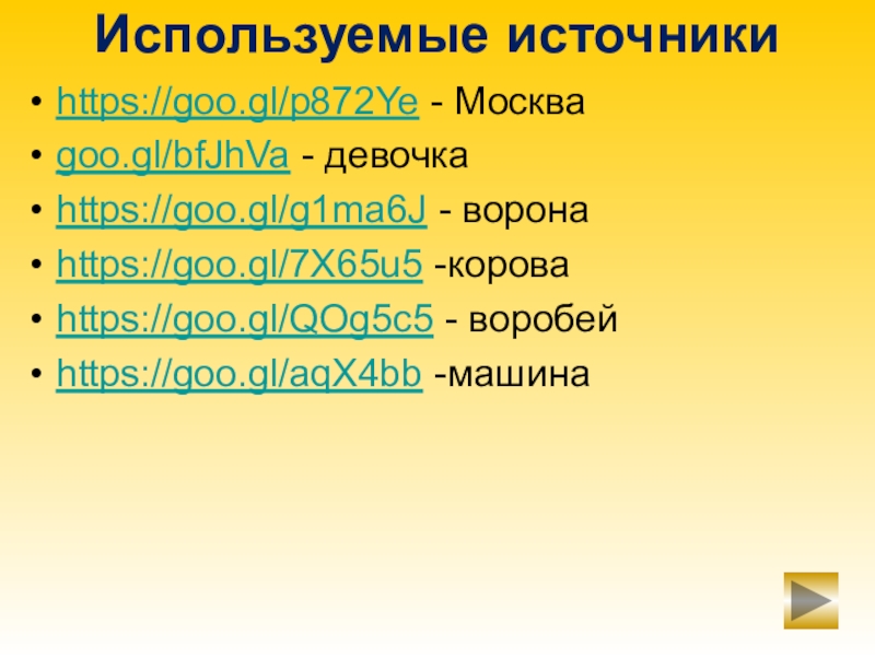 Используемые источники https://goo.gl/p872Ye - Москваgoo.gl/bfJhVa - девочкаhttps://goo.gl/g1ma6J - воронаhttps://goo.gl/7X65u5 -короваhttps://goo.gl/QOg5c5 - воробейhttps://goo.gl/aqX4bb -машина