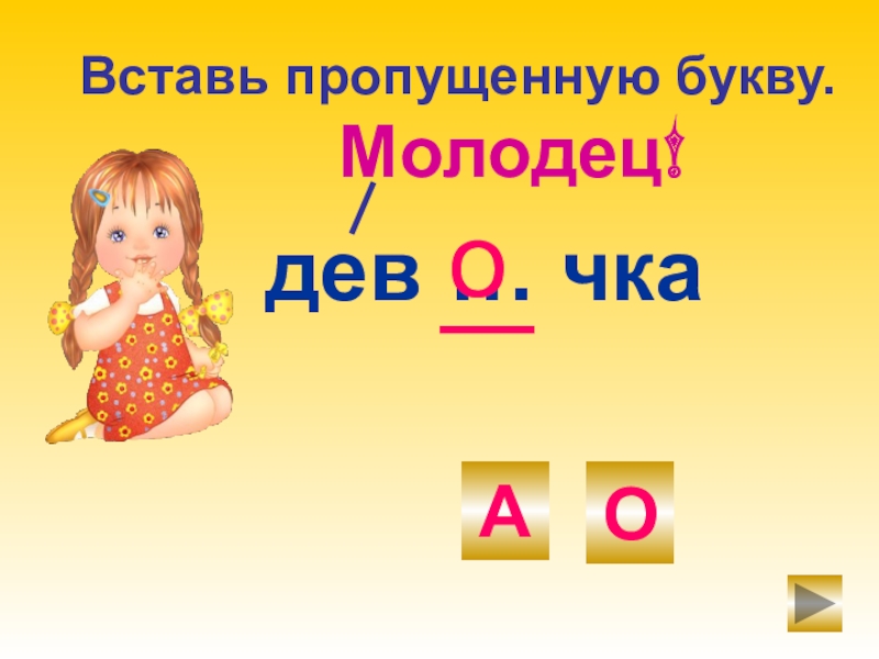 дев … чкаоМолодец!ОАВставь пропущенную букву.
