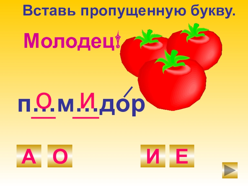 п…м…дорОАИЕиоМолодец!Вставь пропущенную букву.