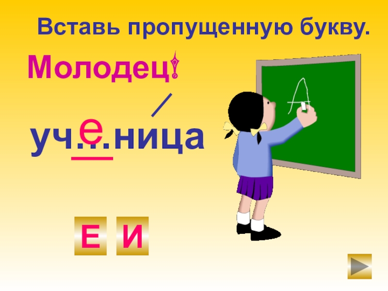 уч…ницаЕИеМолодец!Вставь пропущенную букву.