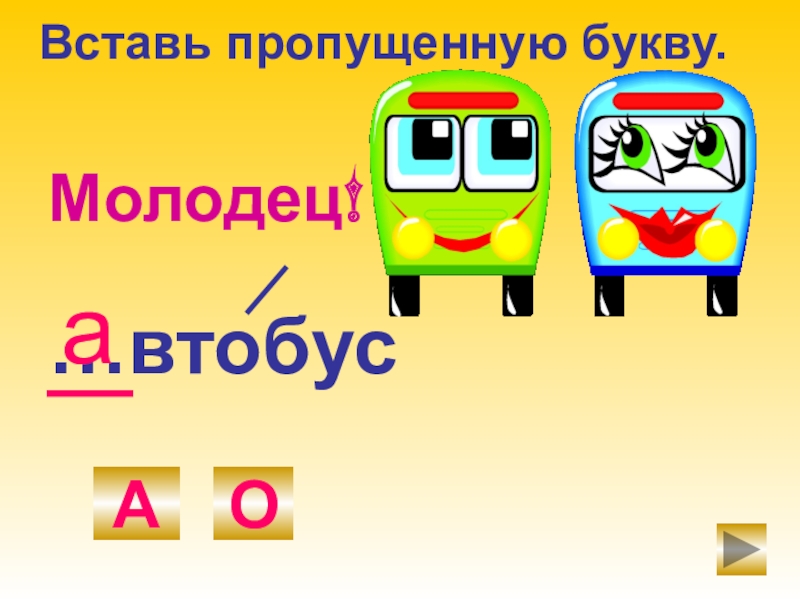 …втобусАОаМолодец!Вставь пропущенную букву.