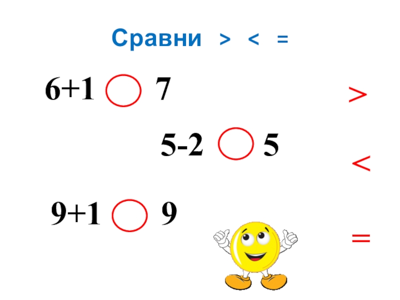 Сравни  >  <  =6+1    75-2    59+1