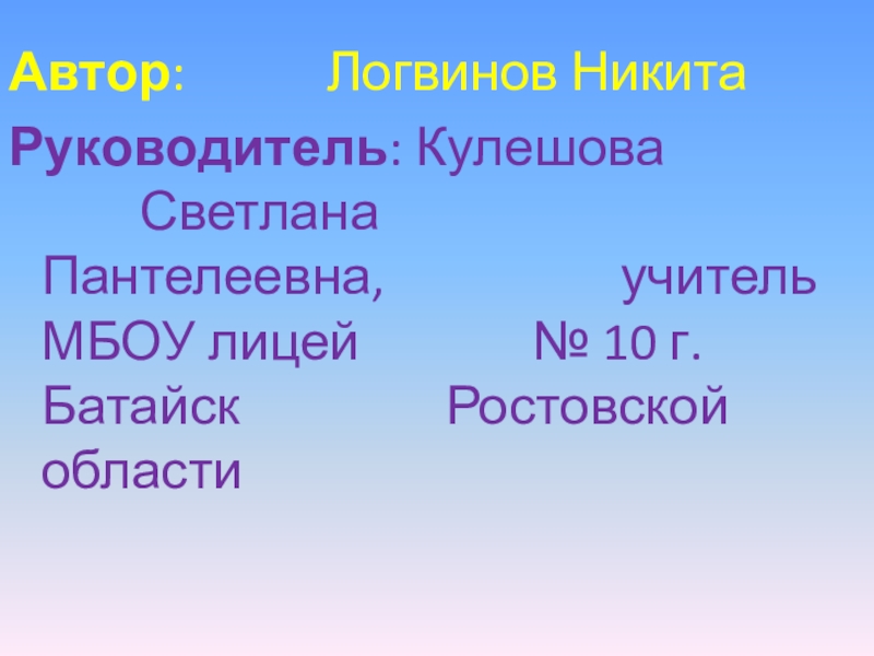 Автор: 		 	 Логвинов НикитаРуководитель: Кулешова 							Светлана 							Пантелеевна, 						учитель МБОУ лицей 				№ 10 г.Батайск 					Ростовской области