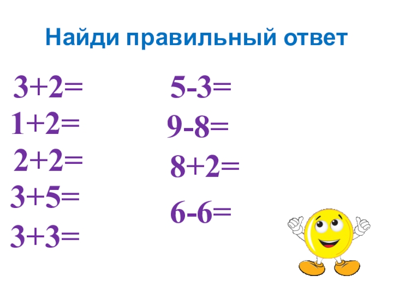 Найди правильный ответ3+3=2+2=5-3=8+2=6-6=1+2=9-8=3+5=3+2=101098765432