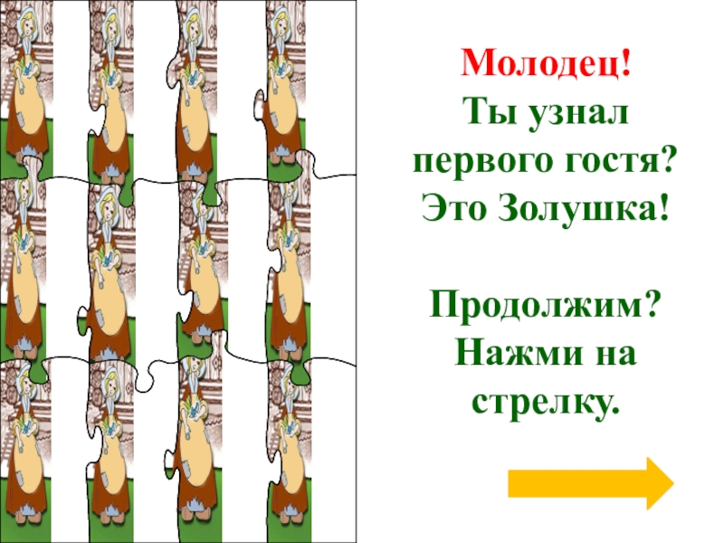 Молодец! Ты узнал первого гостя? Это Золушка!Продолжим? Нажми на стрелку.