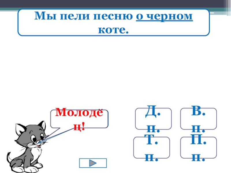 Мы пели песню о черном коте.Д. п.В.п.Т. п.П. п.Подумай!Молодец!