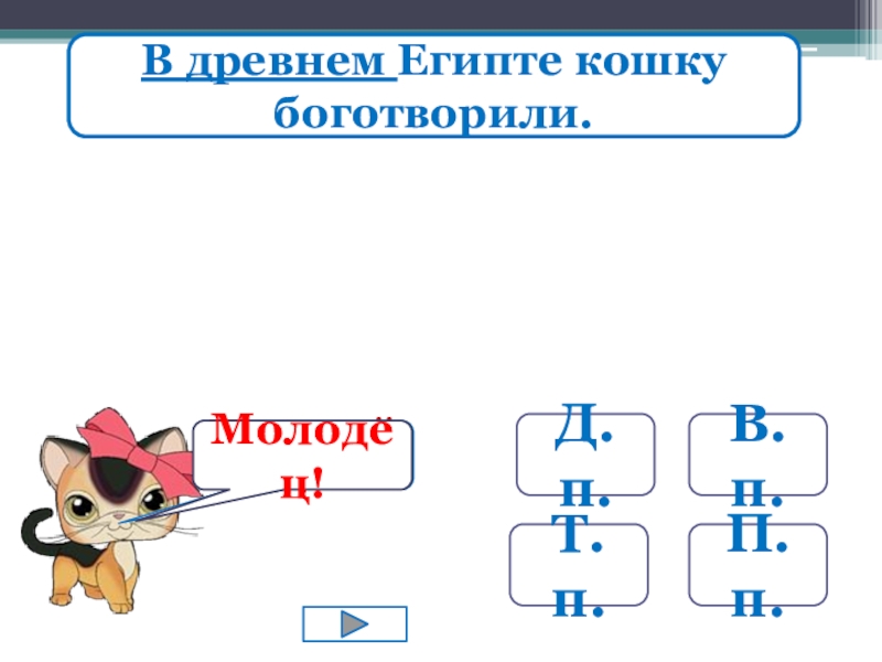 Подумай!В древнем Египте кошку боготворили.Д. п.В.п.Т. п.П. п.Молодец!